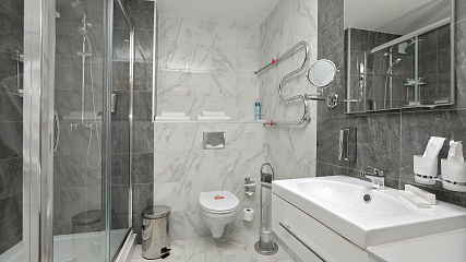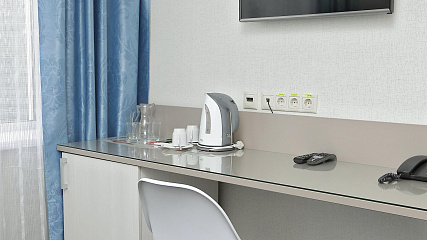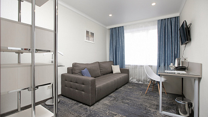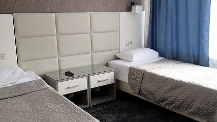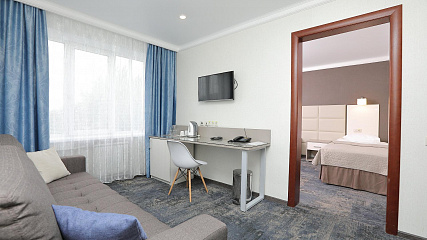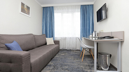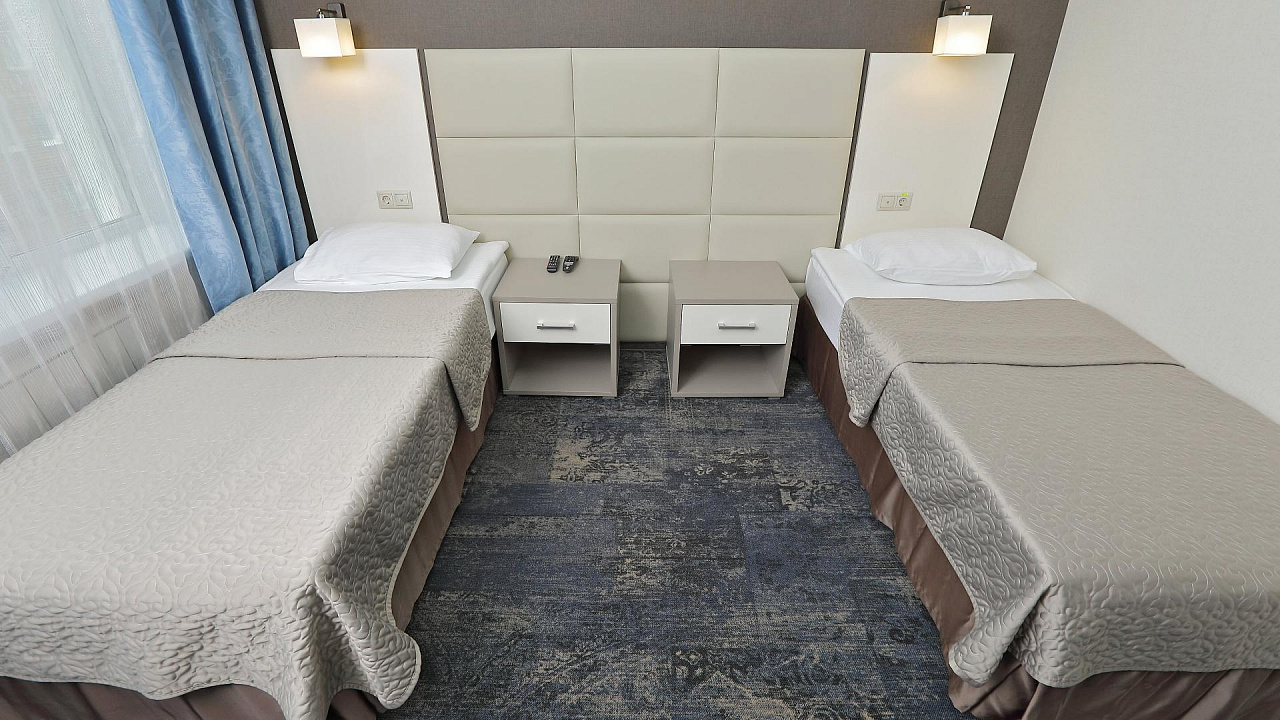 Если Вы путешествуете вдвоем, самый удобный вариант для размещения — двухкомнатный номер Первой категории «Комфорт» с двумя кроватями. Здесь есть все, что необходимо для создания ощущения комфорта и домашнего уюта: в гостиной — удобный диван и телевизор с плоским экраном для отдыха, в спальне — 2 кровати 0,9 × 2 м и выделенная рабочая зона. Гостям отеля мы предоставляем бесплатный Wi-Fi.